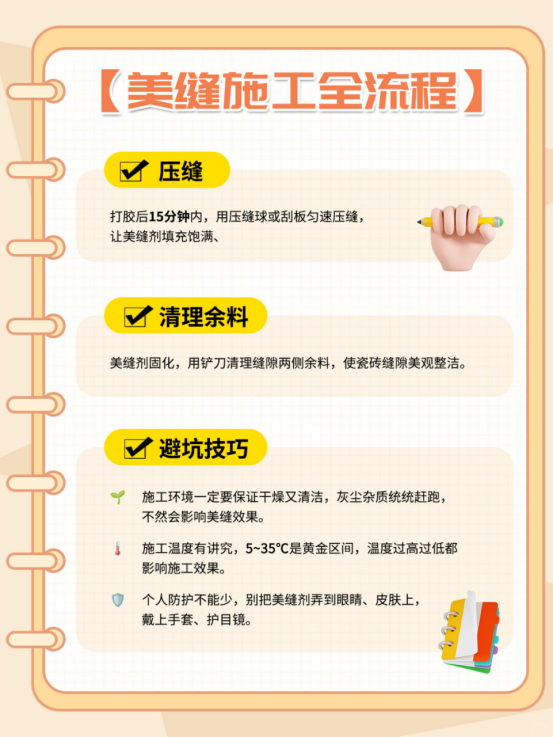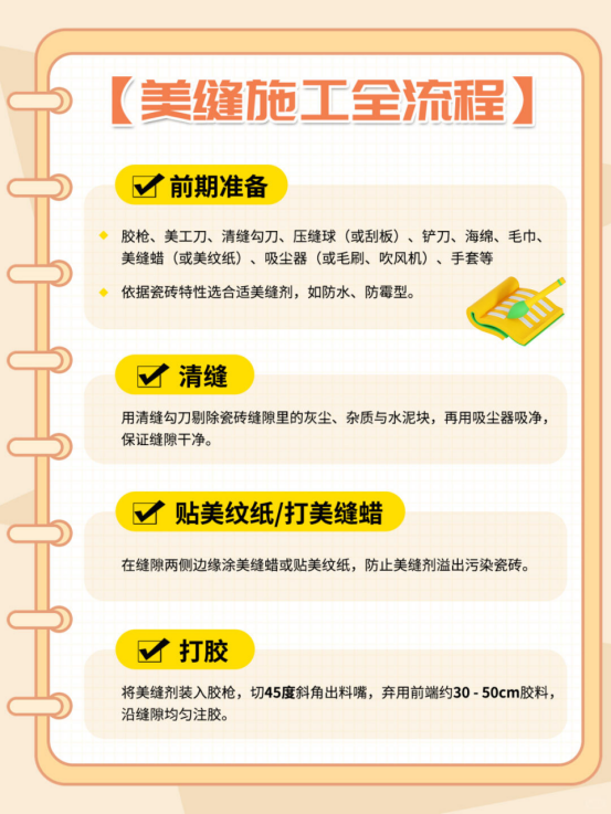 前期准备: 胶枪、美工刀、清缝勾刀、压缝球(或刮板)、铲刀、海绵、毛巾、美缝蜡(或美纹纸)、吸尘器(或毛刷、吹风机)、手套等 依据瓷砖特性选合适美缝剂,如防水、防霉型。 清缝:用清缝勾刀剔除瓷砖缝隙里的灰尘、杂质与水泥块,再用吸尘器吸净,保证缝隙干净。 贴美纹纸/打美缝蜡:在缝隙两侧边缘涂美缝蜡或贴美纹纸,防止美缝剂溢出污染瓷砖。 打胶:将美缝剂装入胶枪,切45度斜角出料嘴,弃用前端约30 - 50cm胶料,沿缝隙均匀注胶。 压缝:打胶后15分钟内,用压缝球或刮板匀速压缝,让美缝剂填充饱满、表面平整。 清理余料:美缝剂固化,用铲刀清理缝隙两侧余料,使瓷砖缝隙美观整洁。 避坑技巧: ��施工环境一定要保证干燥又清洁,灰尘杂质统统赶跑,不然会影响美缝效果。 ��施工温度有讲究,5~35℃是黄金区间,温度过高过低都影响施工效果。 ��个人防护不能少,别把美缝剂弄到眼睛、皮肤上,戴上手套、护目镜。